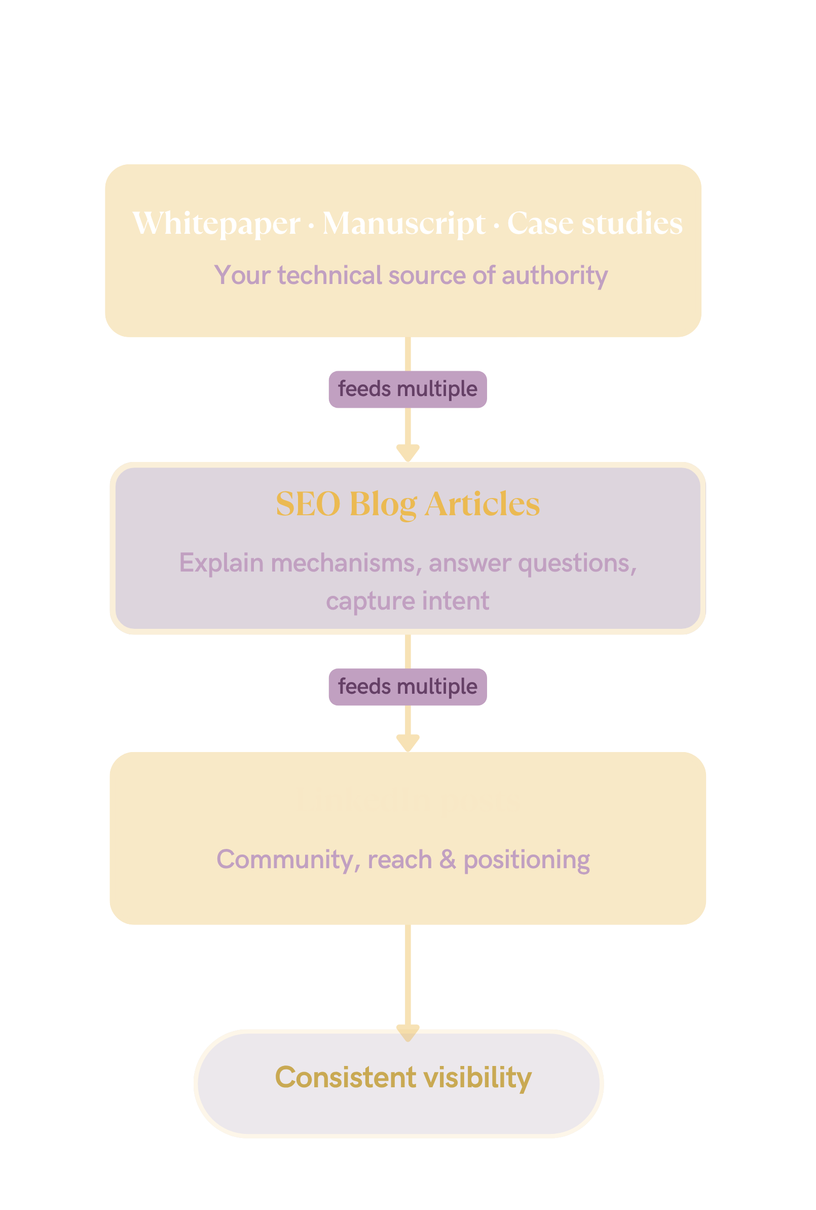 Impact needs visibility. But visibility needs consistency. One post every two months might tick a quarterly goal, but it won't drive business results. That's why we've created the science-to-content pipeline. Your long-format content can feed multiple blog articles that can in turn feed multiple LinkedIn posts. We manage the whole flow so your content is aligned at every level and consistent, either running the whole pipeline for you, or starting with the piece that matters most right now.